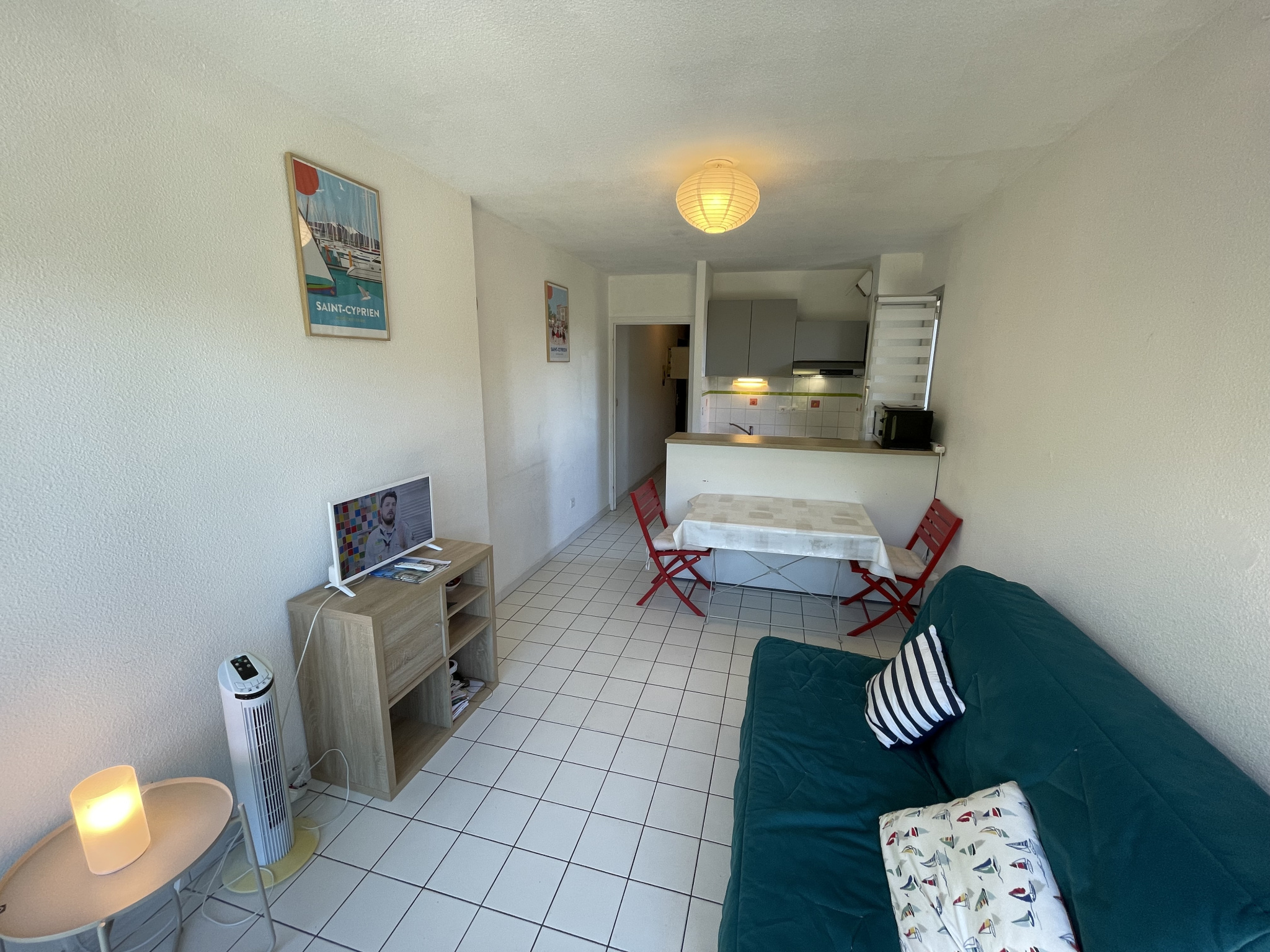 Résidence sur le port, proche des commerces et de la plage. Agréable appartement en angle de 29m2, type Studio cabine meublé, au 2ème étage avec ascenseur. Entrée avec placard/penderie, une grande cabine avec 2 lits superposés et placard (vue canigou), salle d’eau avec cabine douche et wc. Séjour avec canapé convertible BZ, kitchenette à l’américaine équipée. Petite copropriété sécurisée avec ascenseur (Ravalement de façade récent). Vue dégagée, exposition nord/ouest (sans vis-à-vis). Situation idéale au cœur de la station, directement sur le port de Saint Cyprien. Plage à pied env. 700m, Yacht-club, bateaux, commerces et restaurants du port à proximité. Parking public gratuit à côté de la résidence ou grand parking sur le port (parking Joa-Casino). Pied à terre, idéal pour des vacances à petit prix. Vendu meublé. DPE : non soumis.