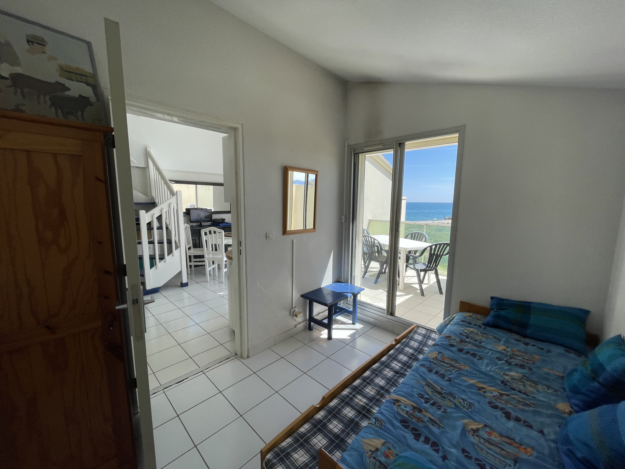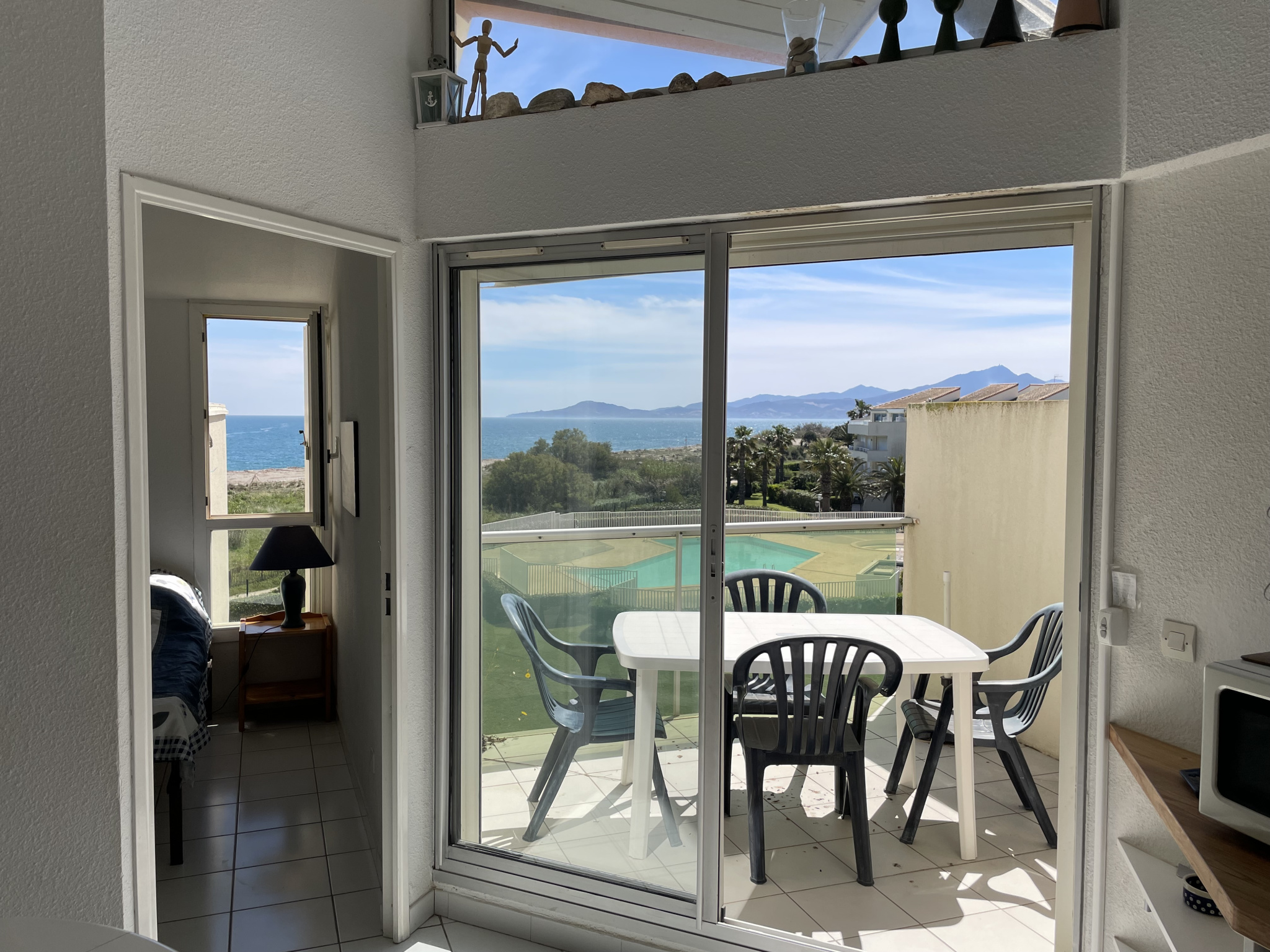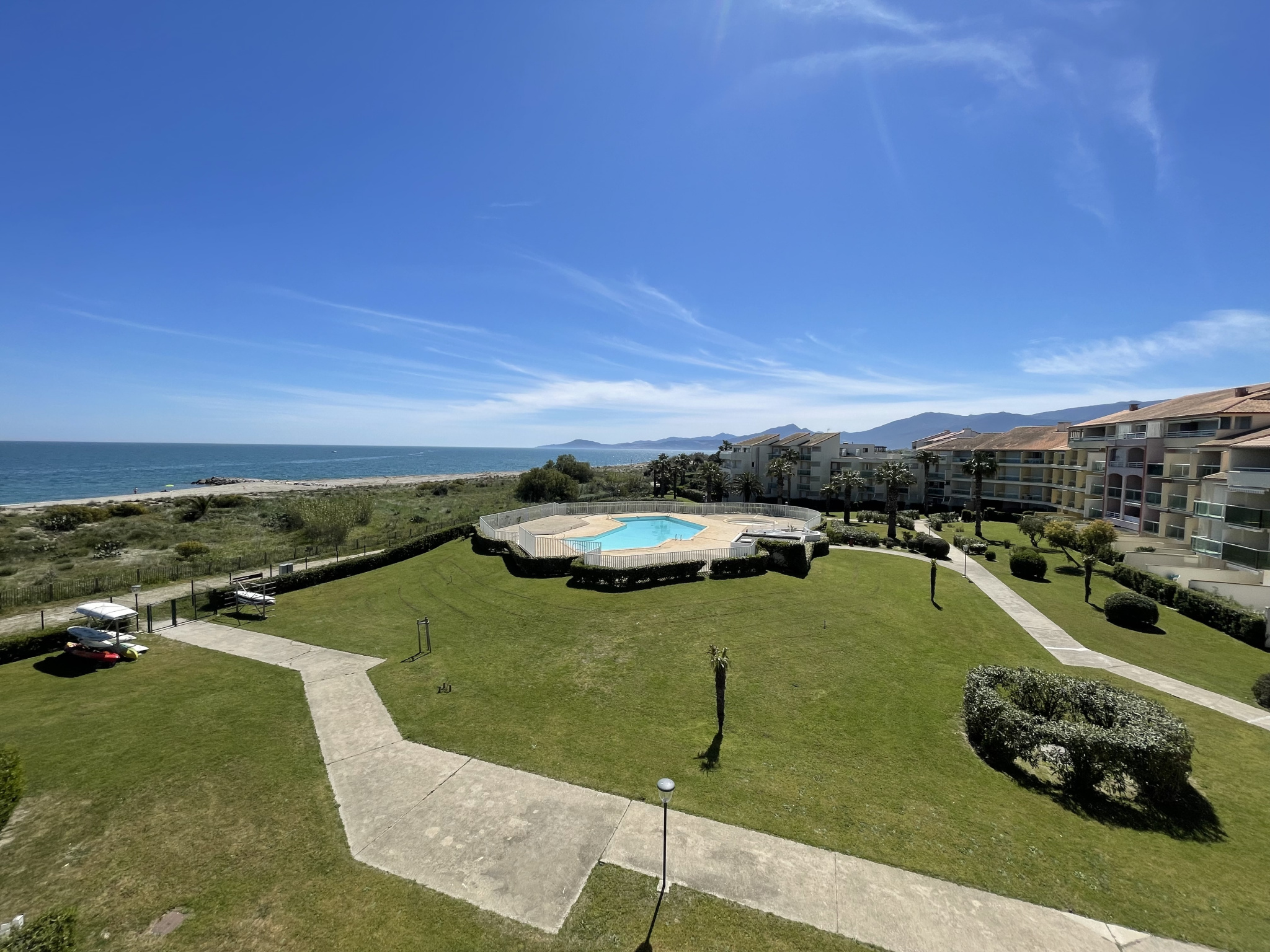 Dans résidence construite sur le sable avec ascenseur, piscine et parking sécurisé. En front de mer avec accès direct à la plage. Appart. 3 pièces Mezzanine sur 2 faces au 3ème et dernier étage face mer et piscine. Surface habitable : 38,73m2. Terrasse expo Sud/Est : 7,15m2. Vue mer, Albères, espaces verts et piscine. Entrée, salle d’eau, wc séparés. Une chambre (vue mer) avec 1 lit 140 et armoire/penderie, une 2ème chambre donnant sur la terrasse (vue mer) avec 1 canapé gigogne tiroir 2x80, commode et penderie. Petite mezzanine avec 1 canapé gigogne tiroir 1x90+1x80 et fenêtre. Séjour avec coin cuisine rénové et équipé en 2022, donnant sur la terrasse équipée avec salon de jardin (volets roulants électriques). Logement très lumineux, sans vis-à-vis. Parking intérieur sécurisé. DPE : (non soumis). Idéal vacances (très bon rapport locatif saisonnier) ou pour vivre à l’année.
